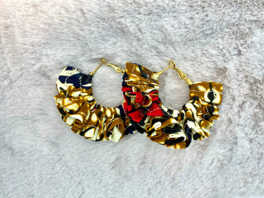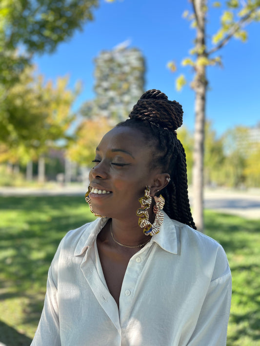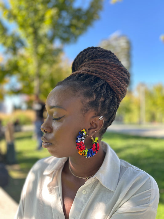 Realizzati artigianalmente dalla nostra collaboratrice Giada, questi orecchini a cerchio nascono dal recupero creativo di rimanenze di tessuto wax, per trasformare ogni scarto in un dettaglio unico e prezioso.