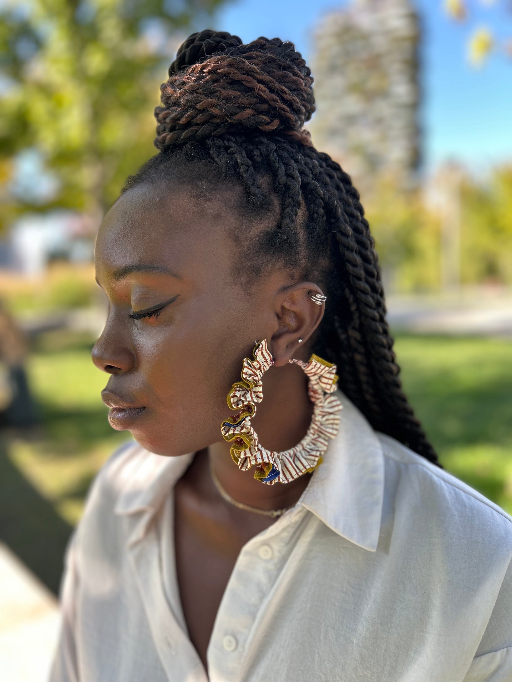 Realizzati a mano, questi orecchini raccontano una storia di recupero e bellezza. Dai ritagli di tessuto wax nascono piccoli cerchi d’arte, dove ogni dettaglio parla di cura, creatività e rispetto per la materia. Un gesto semplice che trasforma ciò che resta in qualcosa che resta.