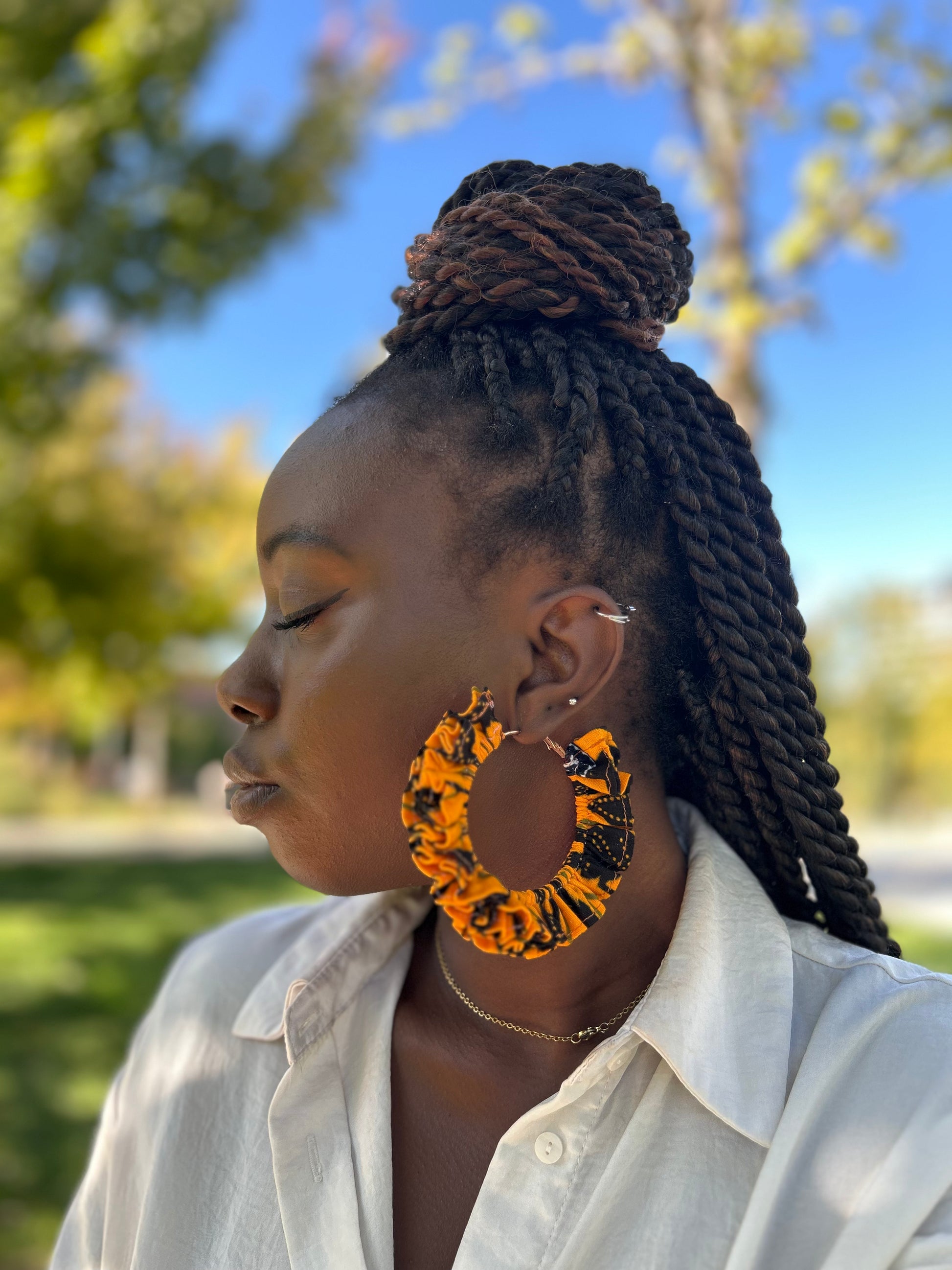 Realizzati a mano questi orecchini raccontano una storia di recupero e bellezza. Dai ritagli di tessuto wax nascono piccoli cerchi d’arte, dove ogni dettaglio parla di cura, creatività e rispetto per la materia. Un gesto semplice che trasforma ciò che resta in qualcosa che resta.